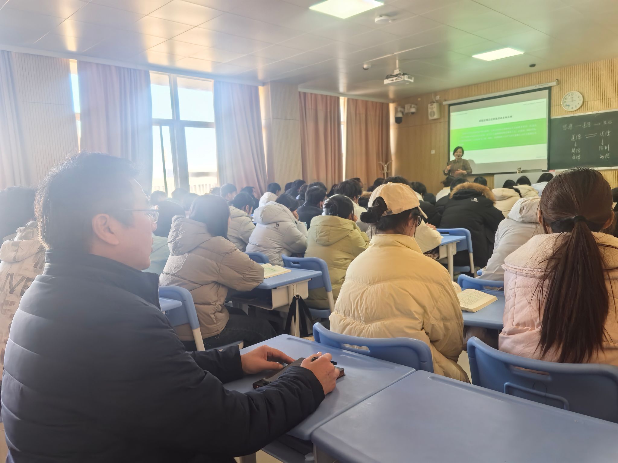 田世立书记听取了王行老师主讲的“思想道德与法治”课程中第五章第一节“社会主义道德的核心与原则”授课,刘全玺校长听取了黄克非老师主讲的“习近平新时代中国特色社会主义思想概论”课程第八章第一节“发展全过程人民民主”授课。听课过程中,两位领导细致观察教师授课状态和课堂教学组织情况,重点关注教学内容设计、教学方法运用、师生互动氛围、学生学习效果等方面,并在课后与授课教师展开交流,调研了党的二十届四中全会精神融入思政课教学的路径策略,对授课教师的专业素养和教学效果给予了充分认可。